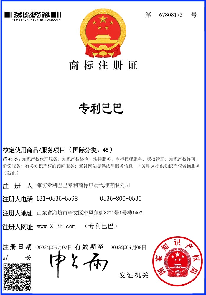 昌乐专利巴巴是潍坊专利巴巴专利商标申请代理有限公司设置在昌乐县的分支机构或下属单位,主要为昌乐企业和个人提供专利申请代理服务、专利年费代缴业务、专利维权业务、专利无效业务等。