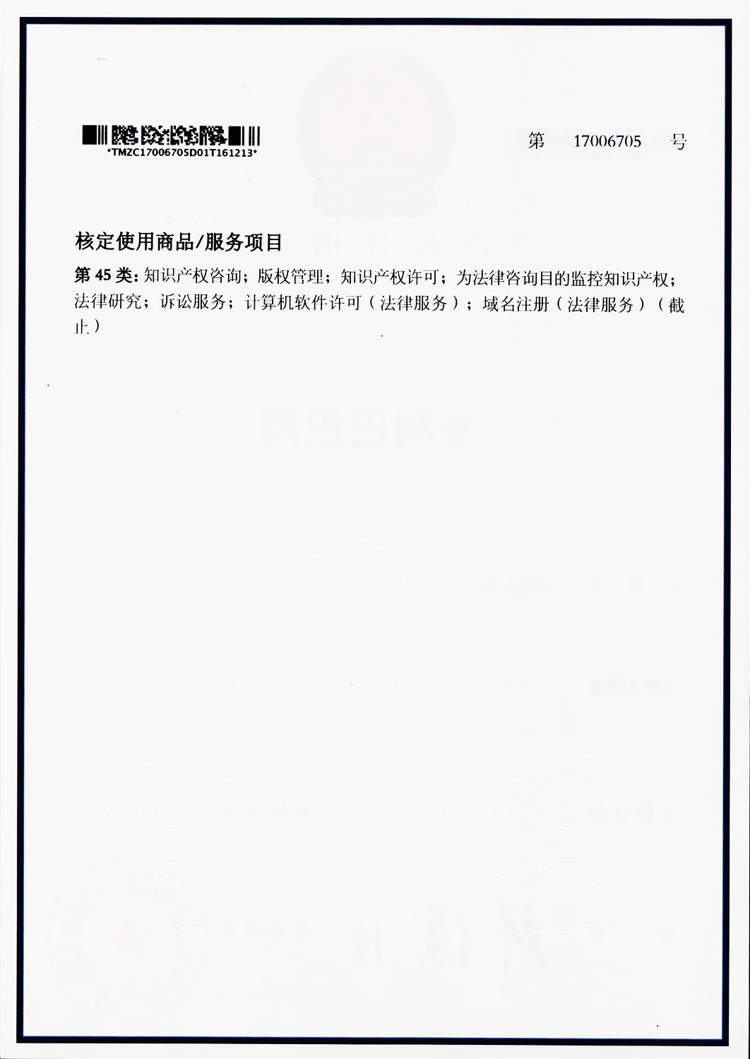 专利巴巴网品牌商标的核定使用商品及服务项目:知识产权咨询; 版权管理; 知识产权许可; 法律研究; 诉讼服务; 计算机软件许可(法律服务); 域名注册(法律服务); 为法律咨询目的监控知识产权 。