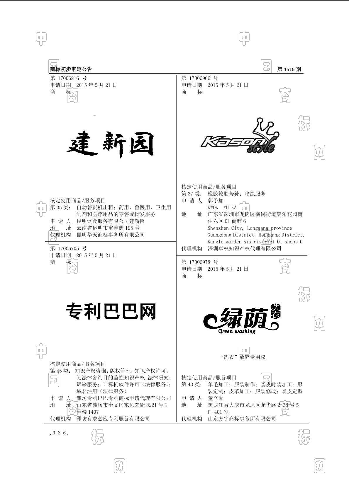 2016年08月20日,潍坊专利巴巴专利商标申请代理有限公司申请的专利巴巴网商标在第1516期获得初审公告。